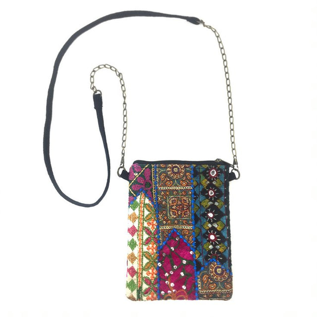 The perfect bag for anyone on the go. Beautifully repurposed Kutch textiles are hand-selected and stitched together to cover the front and back of this colorful, tactile bag. It has a durable canvas strap with chain accent, zip closure, plus an interior pocket.