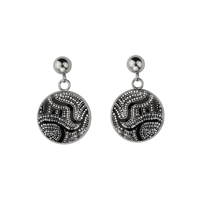 These striking earrings feature artwork from Seven Sisters Dreaming by Athena Nangala Granites, capturing the spirit of Indigenous Australian storytelling through intricate design and craftsmanship. Made from stainless steel with resin and accented with silver leaf, the earrings reflect the rich cultural heritage and Jukurrpa (Dreaming) narratives of Australia’s First Nations people. Presented in a stylish box that doubles as a display, these wearable artworks are part of the Shared Dreaming collection—an initiative dedicated to showcasing the diverse talents of Indigenous artists across the country. More than just jewelry, they are a celebration of culture, a meaningful gift, and stunning conversation starters.