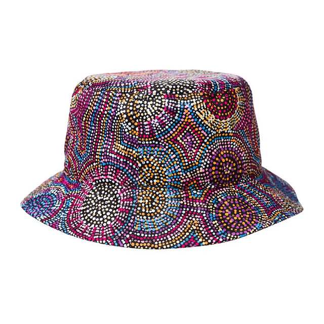 Add a meaningful pop of color to your everyday look with this bucket hat featuring Mina Mina Dreaming by Warlpiri artist Tina Napangardi Martin. Inspired by a powerful women’s Dreaming story from Warlpiri Country, the design captures the movement and spirit of the ancestral women’s journey at the sacred site of Mina Mina. Lightweight, comfortable, and made from 100% polyester, it’s perfect for sunny days or casual outings. Each hat is unique thanks to the varying placement of the artwork, so no two are exactly alike. Created in collaboration with Warlukurlangu Artists, a 100% Aboriginal-owned art center, it’s a stylish way to carry culture with you and support authentic Indigenous Australian art.
