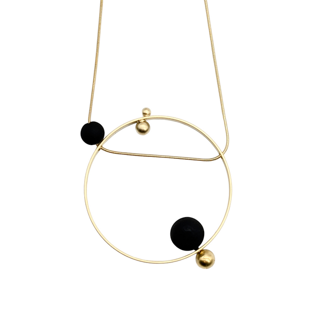 Inspired by planets and constellations, this modern necklace features a large ring pendant that hangs delicately from a 12k gold finish brass chain, adorned with solid black acrylic orbs. Nickel-free and statement-making, this piece is perfect for adding a playful yet sophisticated touch to any outfit.