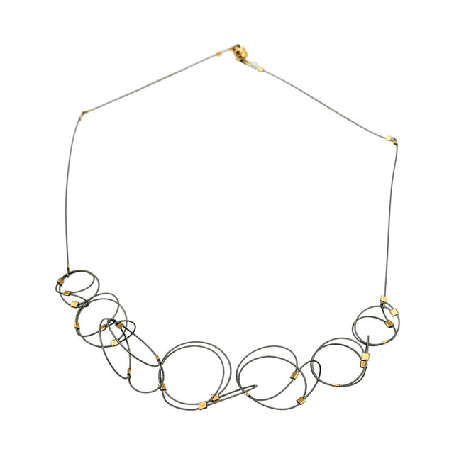 Lightweight and architectural, the 3D Necklace adds a striking dimension of style with its sculptural circular forms that flow elegantly along the neck. Crafted from flexible, woven stainless steel mini cable finished with nylon for a smooth, comfortable feel, each piece is hand-finished with 14k gold fill accents. Measuring 18 inches in length and secured with a bezel-set neodymium rare earth magnet clasp, this hypoallergenic, travel-friendly necklace is engineered with metal memory, allowing it to collapse and return to its original shape while maintaining its elegant, architectural design.