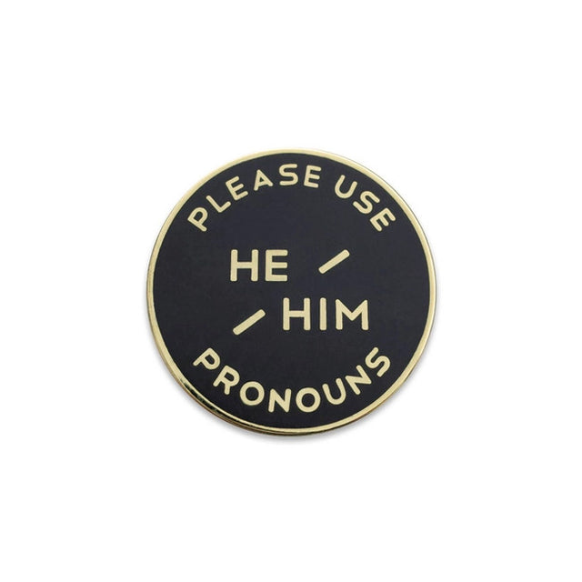 The Black & Gold Circular Enamel Pronoun Pin: He/Him combines elegant, minimalist design with bold visibility, featuring crisp, easy-to-read typography in durable black enamel with gold accents. Stylish enough to complement any outfit and secured with a comfortable rubber clutch, this pin is both a statement of identity and a symbol of support. Plus, 10% of profits are donated to ecological and LGBTQ+ organizations, making it a meaningful accessory that gives back.