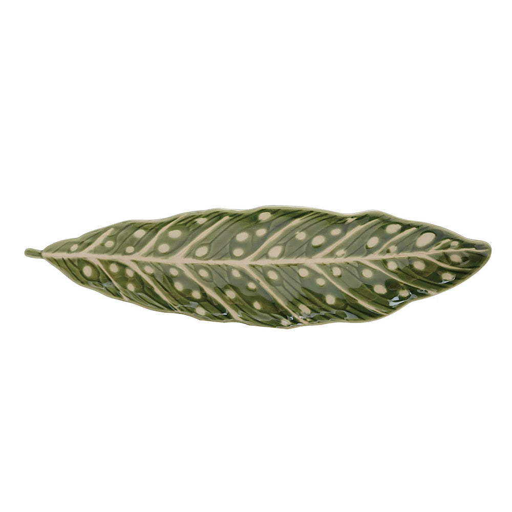 Bring a fresh, botanical touch to your home with this green and white stoneware leaf plate. Inspired by the dramatic curves of an alocasia and the playful dots of a begonia, its raised wax relief design adds depth and texture you can see and feel. The glossy finish highlights the rich green color, making it a beautiful accent on a table, shelf, or wall. Use it to serve small bites, hold jewelry, or display on its own as art. It’s an easy way to add natural beauty and personality to any space.