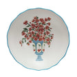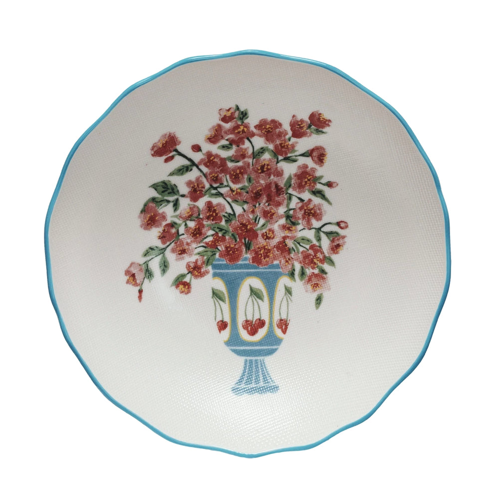 This textured stoneware salad bowl features a floral arrangement in a classic vase, giving it the look of a painted still life. The softly raised surface adds subtle detail, while the delicate flowers and charming illustration bring warmth and character to your table. A scalloped edge and bright blue rim frame the design with a fresh pop of color. Perfect for serving salads, fruit, or shared dishes, this bowl adds beauty and a cheerful touch to any gathering.