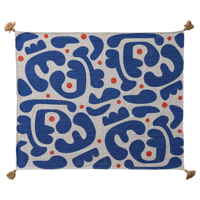 Add a touch of modern flair with this double-sided, recycled cotton blend throw blanket. Featuring abstract blue shapes with red-orange dots against a grey background, it’s a bold statement piece for any room. Finished with tassel corners, this eco-friendly throw blends comfort, style, and artistry in one unique design.